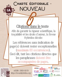 Volume | – 12 pages minimum et 17 pages maximum (du titre aux références bibliographiques) – Utiliser obligatoirement le Template word. Téléchargez [ICI] – Les textes sont soumis au test anti-plagiat via Compilatio avant publication Standards appliqués par la Revue Hybrides [0-20%] (accepter) [21-30%] (renvoi à l’auteur pour mise à jour) [31%-plus] (Rejet de l’article) |